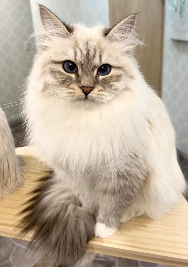 フェリスモカではスタンダードに基づき、キャットショーで認められる本物のサイベリアンの育成を心がけています。また、目の色の美しさにも特化しており、海外ではジェム(宝石)と呼ばれる発光しているようなブルーやグリーンの目の色の輩出に勤しんでいます